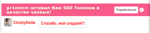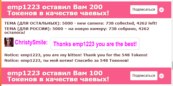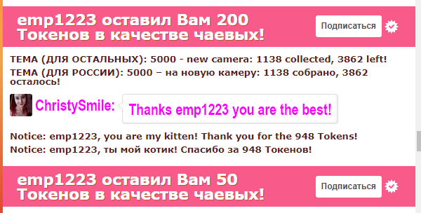 Düğmeye tıklayarak, ChristySmile 'nı ana sayfadaki ilk konuma 60 saniye yükseltebilirsiniz. Bu süre zarfında modelin sohbet odası çok daha görünür ve inanılmaz derecede popüler olacak! Eyleminizle ilgili bir bildirim sohbette görünecek ve modelde görünecek ve diğer sohbet kullanıcıları görüntülenecektir. ChristySmile, bu jesti takdir ettiğinizden ve size karşı ölçülemeyeceğinden emin olabilirsiniz!