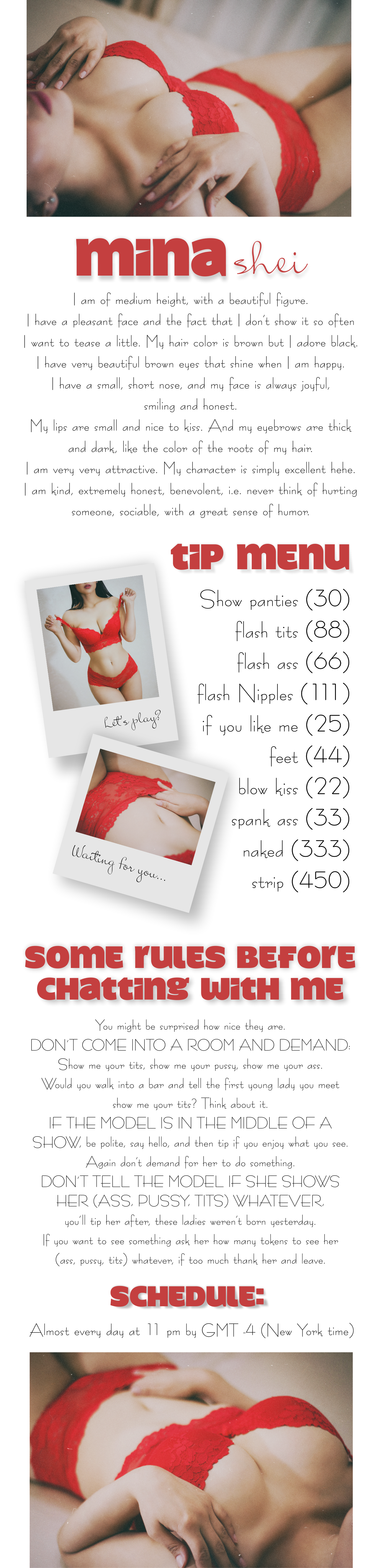 Düğmeye tıklayarak, MinaShei 'nı ana sayfadaki ilk konuma 60 saniye yükseltebilirsiniz. Bu süre zarfında modelin sohbet odası çok daha görünür ve inanılmaz derecede popüler olacak! Eyleminizle ilgili bir bildirim sohbette görünecek ve modelde görünecek ve diğer sohbet kullanıcıları görüntülenecektir. MinaShei, bu jesti takdir ettiğinizden ve size karşı ölçülemeyeceğinden emin olabilirsiniz!