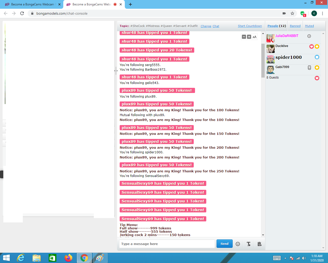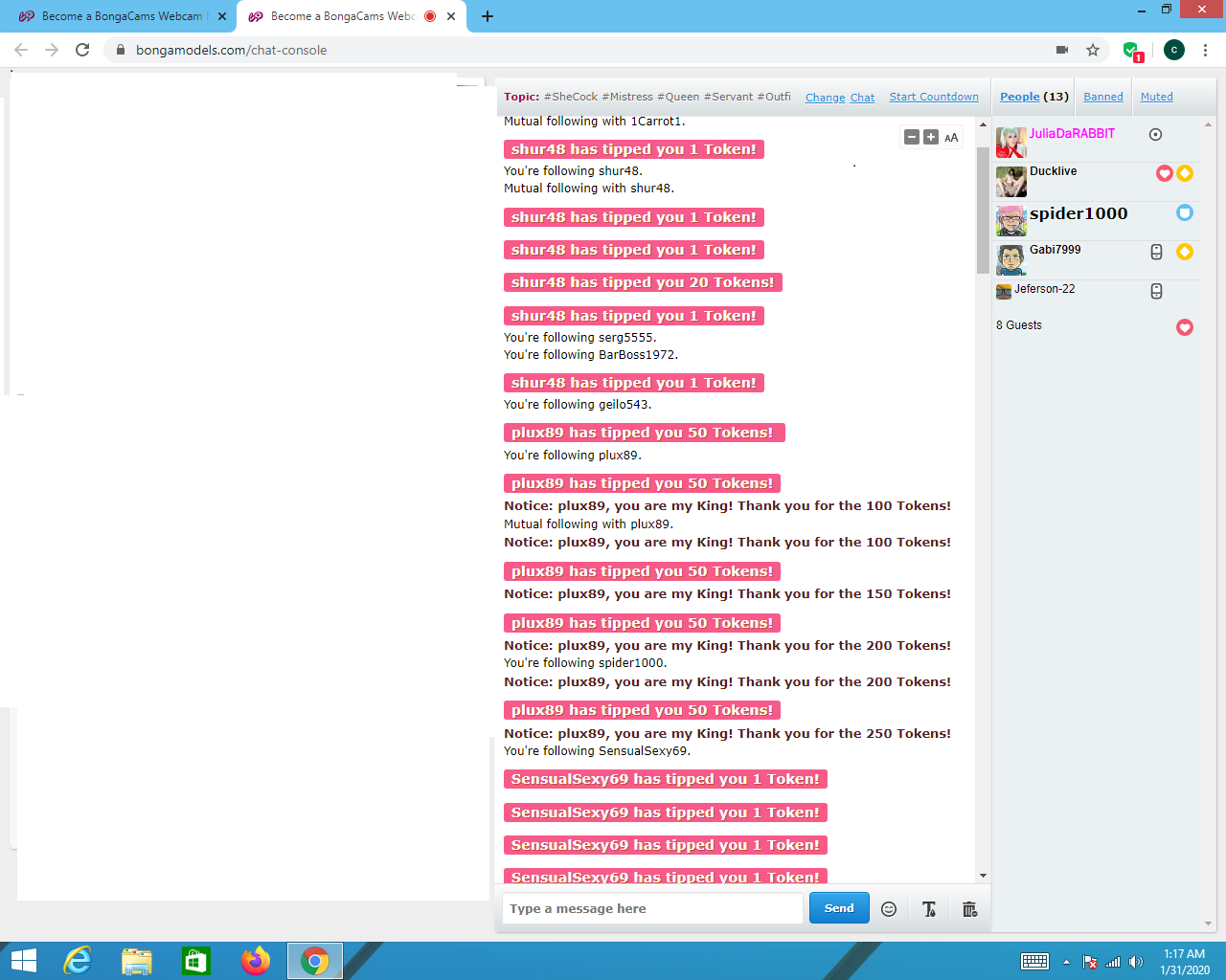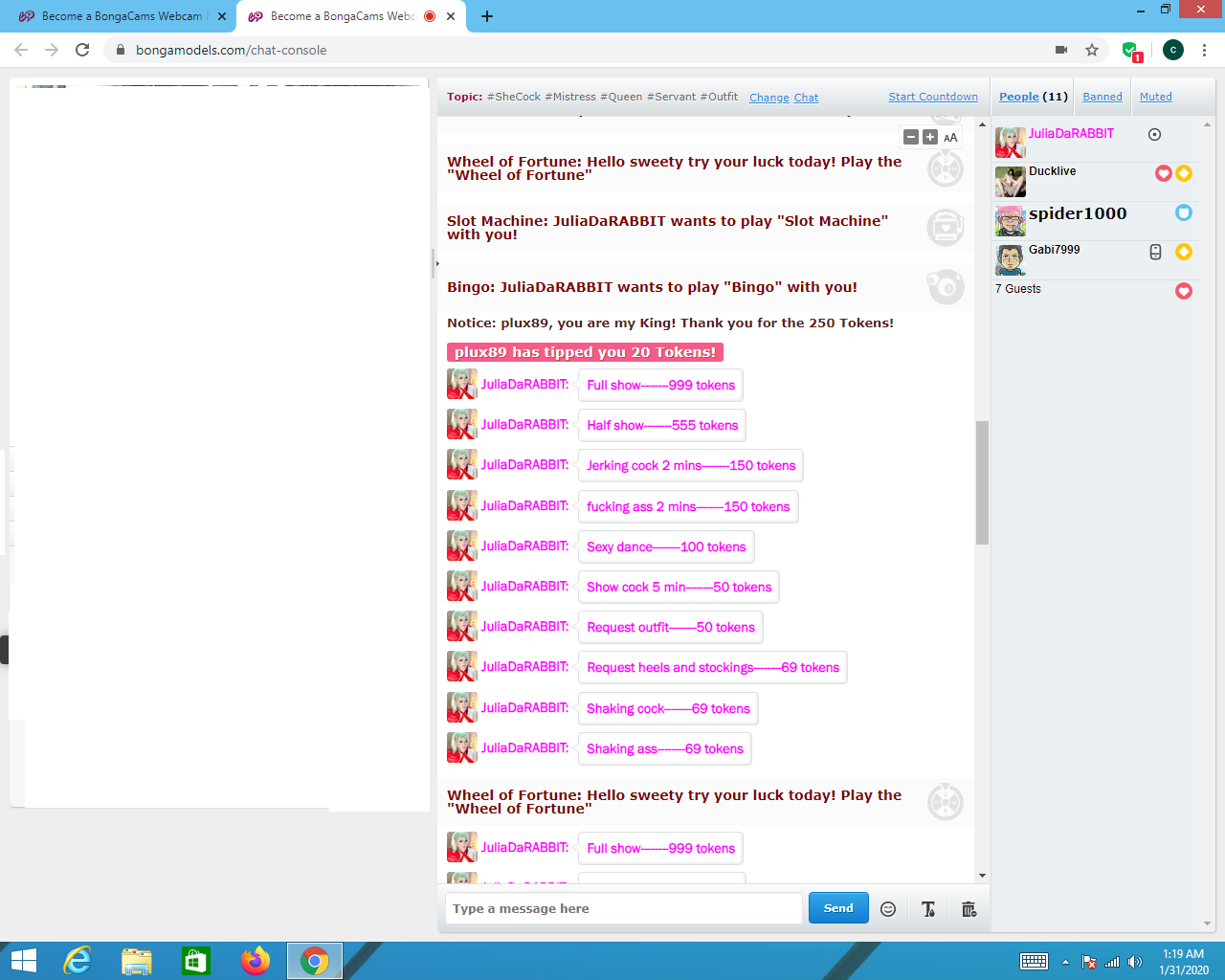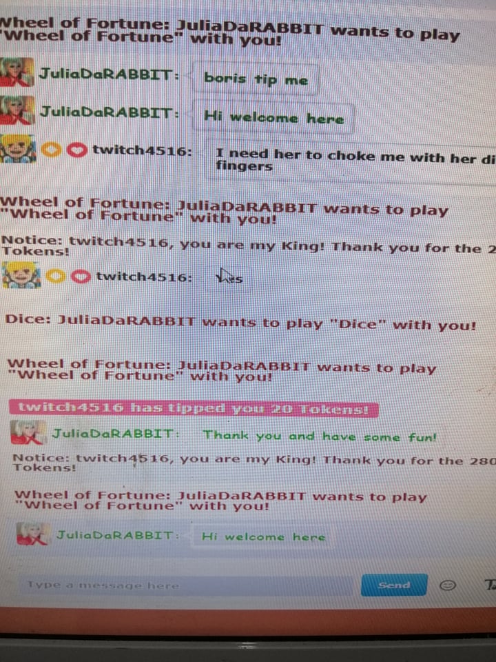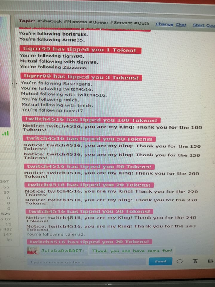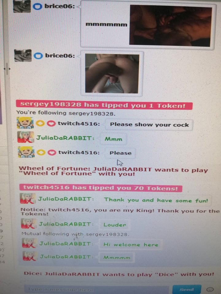 Düğmeye tıklayarak, JuliaDaRABBIT 'nı ana sayfadaki ilk konuma 60 saniye yükseltebilirsiniz. Bu süre zarfında modelin sohbet odası çok daha görünür ve inanılmaz derecede popüler olacak! Eyleminizle ilgili bir bildirim sohbette görünecek ve modelde görünecek ve diğer sohbet kullanıcıları görüntülenecektir. JuliaDaRABBIT, bu jesti takdir ettiğinizden ve size karşı ölçülemeyeceğinden emin olabilirsiniz!